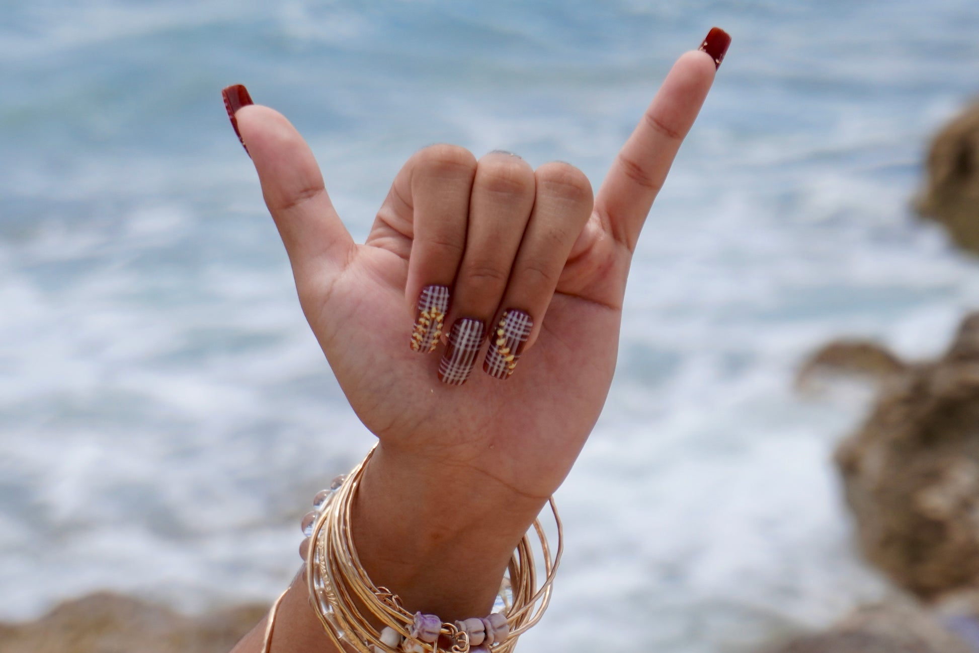 Long Square Nails with a deep chocolate brown and white palaka and puakenikeni lei